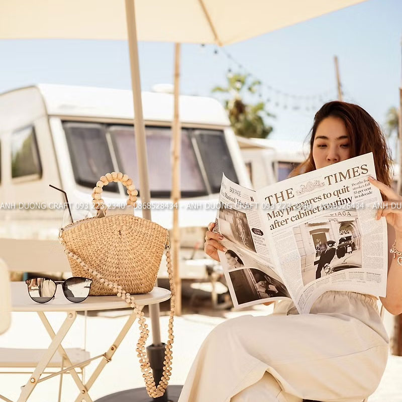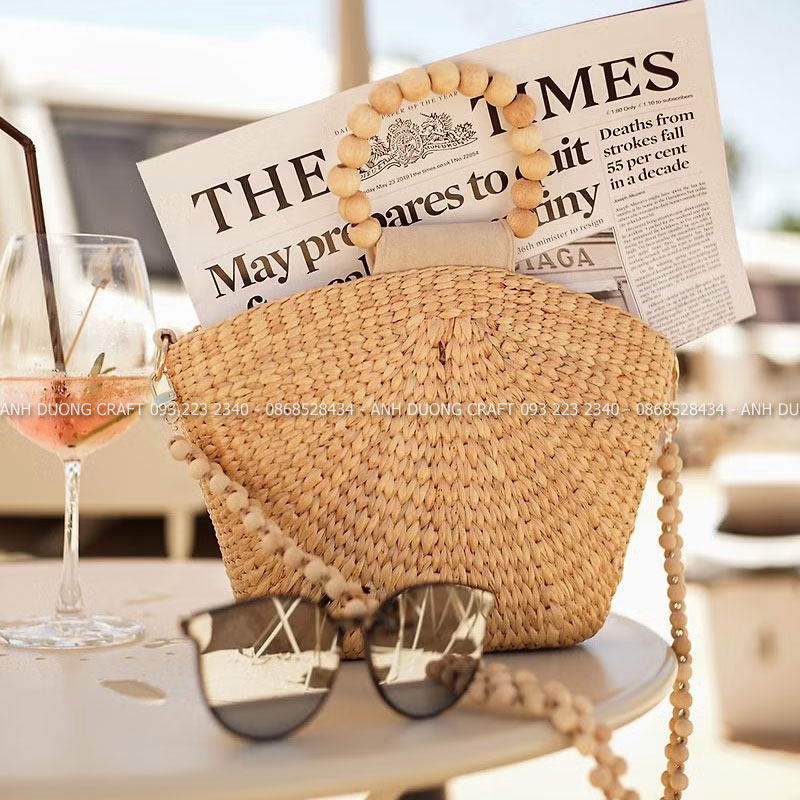 Túi đan lục bình hình thang, tay cầm tròn hạt gỗ.